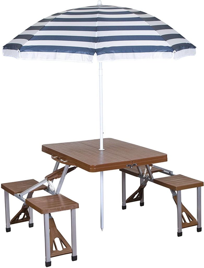 In addition, this camping table is spacious, and with four chairs, you can conveniently feed a group of four friends during your camping outing. Another outstanding feature is the umbrella that this camping table comes with. The umbrella goes through the hole engraved in the middle of the table. This means that if it is sunny, you and your friends are protected. And if there is rain, you have nothing to worry about.